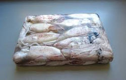 Calamar congelé, (Loligo vulgaris) , pêché dans la zone FAO 34, traité sans aucun additive et congelé en bloc, emballé dans des plastiques en polyéthylène et cartons ondulés et classé selon 7 calibres.